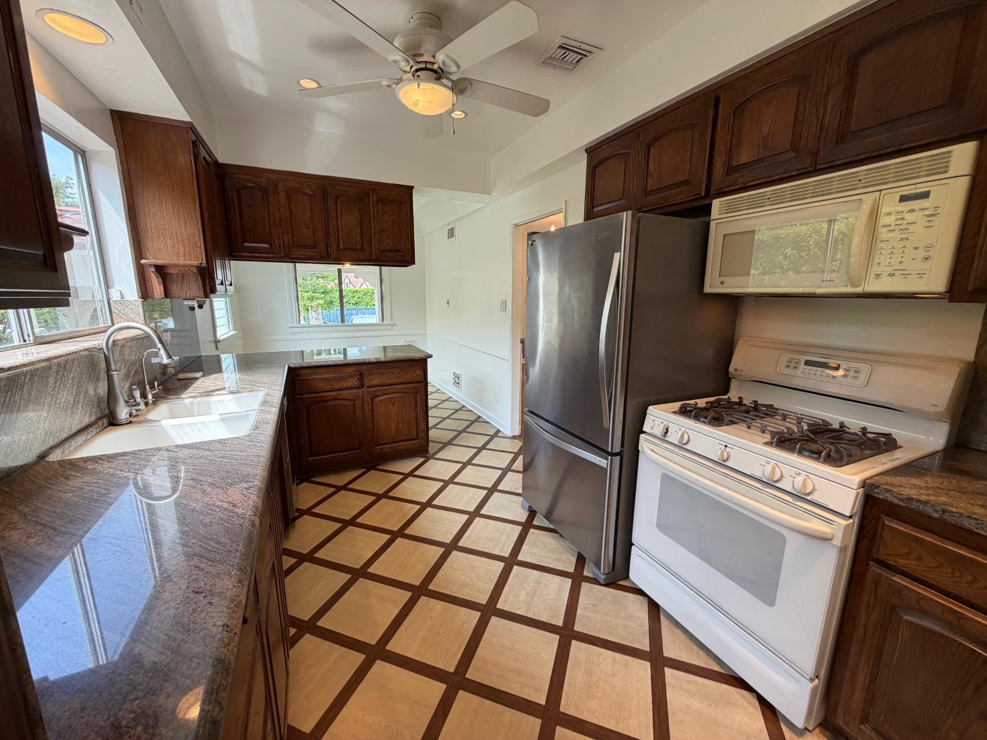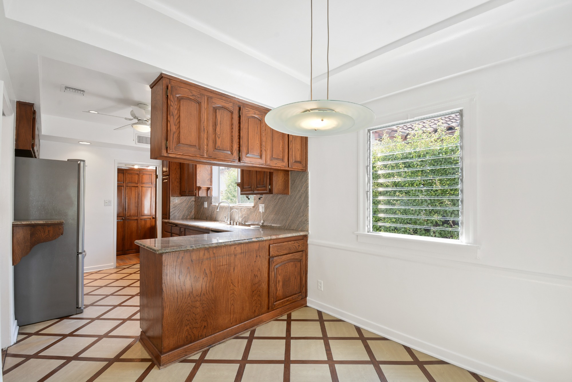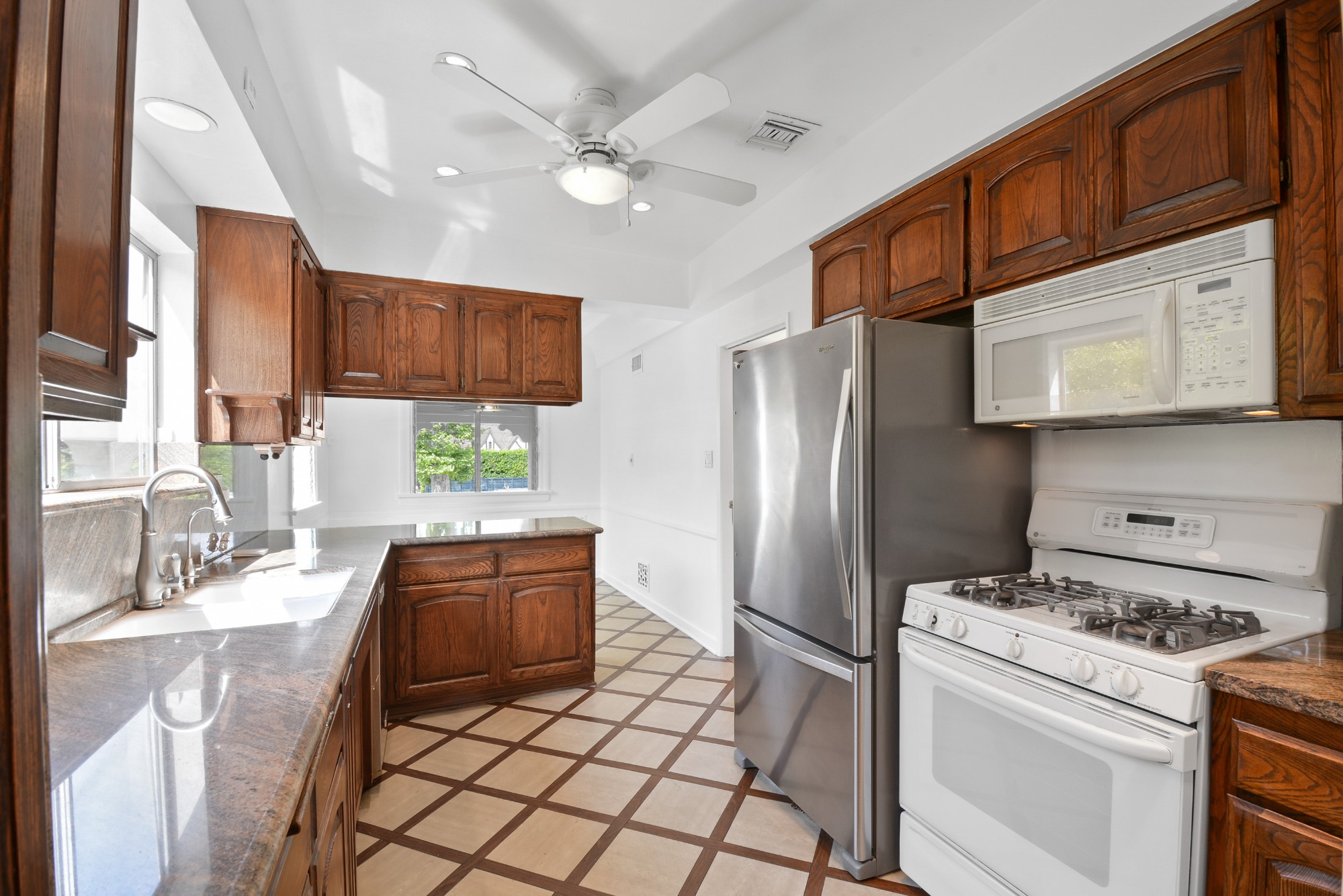 -Kitchen with breakfast nook and garden-facing family room.